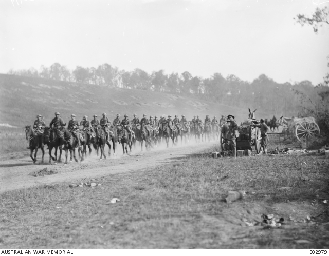 English: The 13th Australian Light Horse moving up past Gressaire Wood to participate in the attack that morning near Bray by the 9th Infantry Brigade. Left to right: 308 Sergeant (Sgt) Leslie Rae Lucke; 178 Sgt Gordon Drane; Corporal A. Mason; 63 Trooper (Tpr) Leonard Horwood; Tpr L. Tschampion; 474 Tpr Albert Tipper; unidentified; Tpr A. Burns; Tpr E. Waters; Tpr W. R. Rathman; Tpr W. Barrett; 1437 Tpr Francis Norman Young; unidentified; Tpr R. J. Jenkins; Tpr C. P. Robinson; unidentified; unidentified; Lance Corporal J. B. Abbotts; five unidentified. See E02979K for position of those named in this caption. |