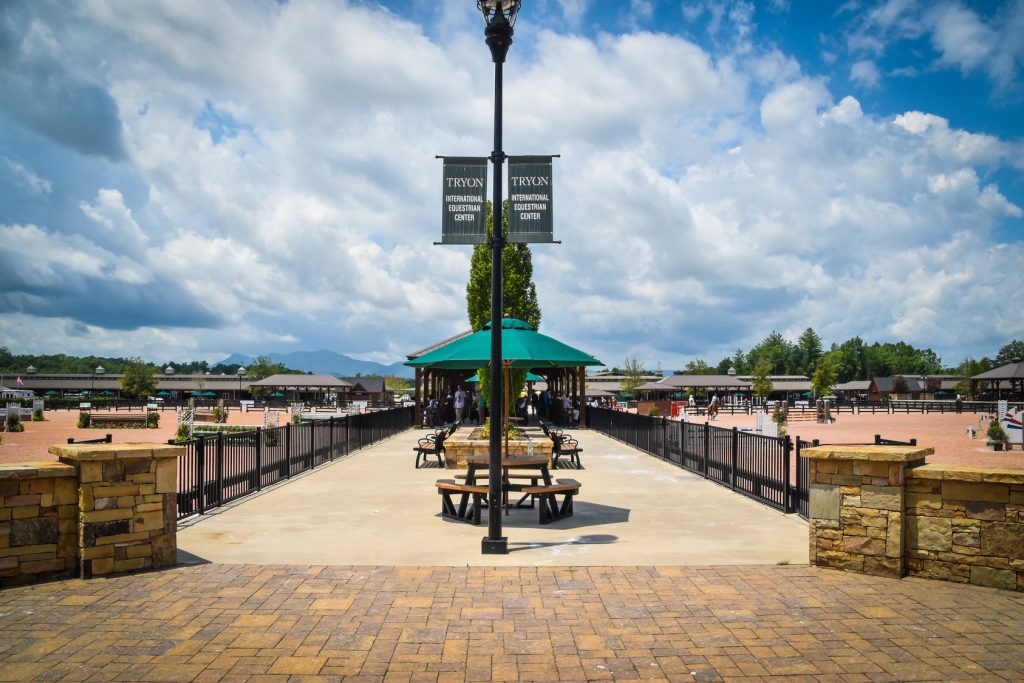 Nestled in the foothills of the rolling Blue Ridge Mountains of North Carolina, sits an equestrian complex that seemingly pops up like an equestrian mirage in the middle of miles of highway. Freshly painted black wood fencing engulfs the center and outlines the many show rings, the grand stadium, the derby field, schooling rings and the separate footpaths for horses and riders. The permanent stables have large matted stalls, complete with optional windows for the horses to hang their heads out (or make feeding easier), built in halter and bucket hangers, and already mounted fans. Who else hates hanging fans at horse shows? The concrete aisles are wide enough for tack trunks, multiple wheel barrels, and grooming cross ties. The tack rooms have secure keypads, which means I was never taking expensive tack to my car each night. The front of each stable aisle has picnic tables with umbrellas, perfect for some down time spent with your barn squad. And let’s talk about the bathrooms located within 100 feet from each barn aisle. Each bathroom area has 3 clean toilet stalls, two sinks with soap, a mirror and air conditioning. I also like to mention that there are faux hardwood floors. I know I sound obsessed with the bathroom, but most of our shows in the area have porta potties. You try pulling up sweaty riding breeches in July in 90 degree heat. Actually, try just breathing in a porta potty in July.