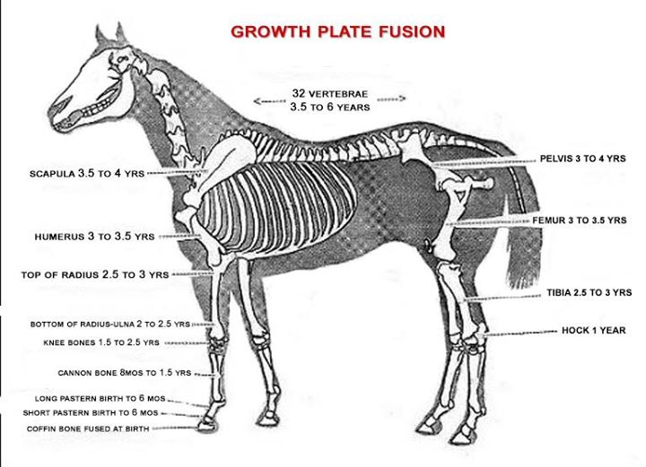 Most horse owners are concerned with the growth plates in the horse’s knees closing up. They’re referring to the process of the growth plates converting from cartilage to bone and then fusing. What most people don’t realize is that there are growth plates, sometimes multiple ones, on either end of every bone behind the skull.
