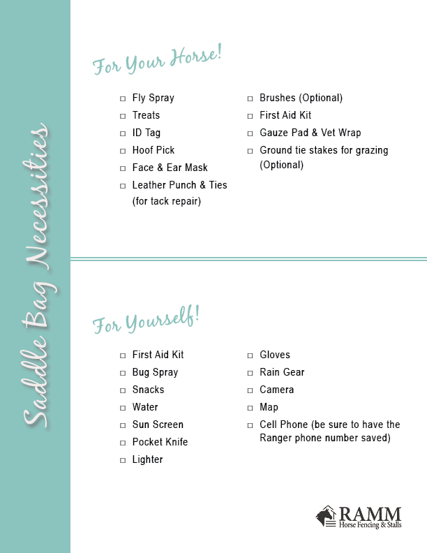 Below is a checklist for both you and your horse. You may want to add to it, depending on where you live or ride. Sunscreen may be your number one item or maybe a compact raincoat. Have your saddlebags or even a good canvas bag ready with the essentials ready to grab and go. You will get out on the trail faster and be well prepared!
