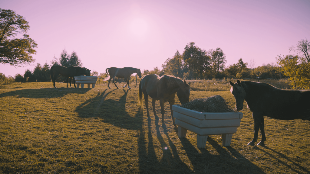 The Hay OptiMizer has provided me peace of mind knowing that my horses always have hay. I also have a clean lot – no walked down, wet hay areas. Horses quickly learn how to eat hay from the OptiMizer. It mimics natural grazing. The horses eat slowly. They select, nibble, and chew their hay—just like they would be eating in the pasture. The OptiMizer is even a great choice for minis, as the legs can be adjusted. In conclusion, the OptiMizer is better for the horse’s health, which is most important. It helps with wear and tear to your fence systems or any other structure etc., in the paddock. The OptiMizer is also more cost-effective than round bales or ground feeding. My horses are happier and healthier by being fed more naturally.