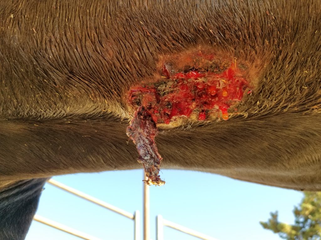 At the time of him acquiring habronemiasis, he was in the process of being sold. I had explained to the soon-to-be new owner his condition and his healing was contingent on his selling. With this care plan, he healed with minimal to no scarring, no proud flesh, or remaining infection.